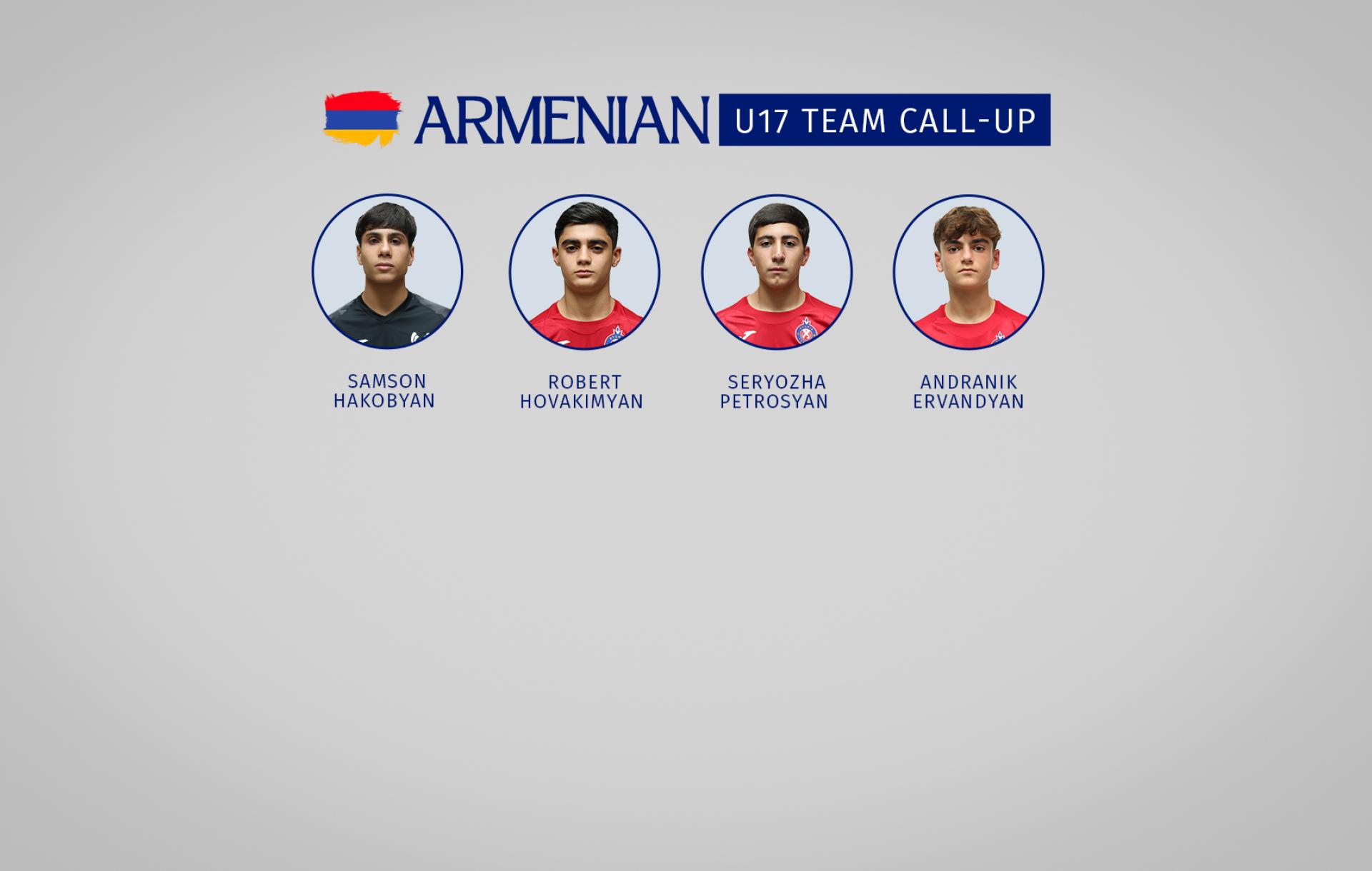 «Փյունիկի» ակադեմիայից 4 ֆուտբոլիստ՝ դարպասապահ Սամսոն Հակոբյանը, պաշտպաններ Ռոբերտ Հովակիմյանը, Սերյոժա Պետրոսյանը և հարձակվող Անդրանիկ Երվանդյանը հրավիրվել են Հայաստանի Մ-17 տարեկանների հավաքական։